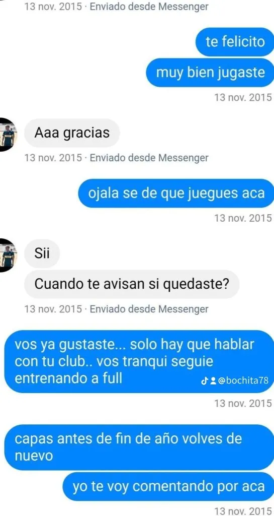 En este sentido, el protagonista en cuestión reveló chats que tuvo con Valentini en el año 2015 en donde le confirmaba que le había gustado su prueba en Boca y que seguramente sería llamado para formar parte de las inferiores: “Te felicito, muy bien jugaste. Vos Ya gustaste en el club…solo hay que hablar con tu club. Vos tranqui, seguí entrenando a full. Capaz antes de fin de año volvés de nuevo“.