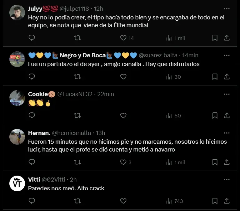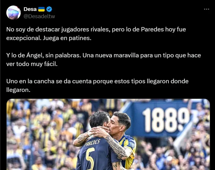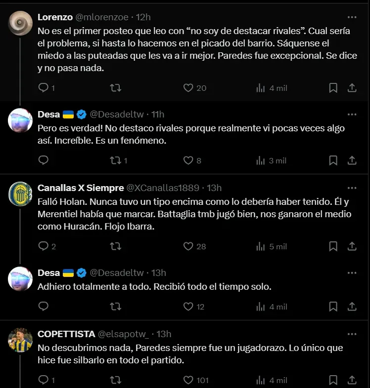 En el partido entre Boca y Rosario Central, tanto Leandro Paredes como Ángel Di María fueron las grandes figuras del encuentro. Y, por el lado del volante Xeneize, los hinchas Canallas no dudaron en destacarlo por su gran nivel: “Lo de Paredes hoy fue excepcional”, “Juega en patines”, y “Es un fenómeno”.