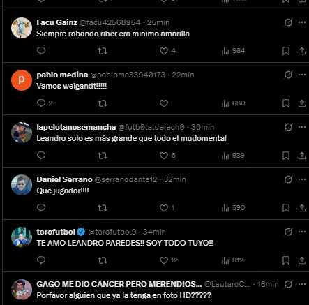 En las redes sociales, los hinchas estuvieron muy atentos al partido y se rindieron con el rendimiento de Leandro Paredes. El 5 convirtió el único gol del partido desde los doce pasos y fue uno de los mejores de la cancha.