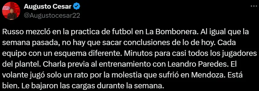 Y aunque en la semana se barajó que estaba trabajando aparte, este jueves fue parte del ensayo futbolístico de Russo en La Bombonera. Aún así, no lo terminó. El periodista Augusto César reveló en su cuenta de X (Twitter) que Leandro jugó solamente un tiempo en la práctica.