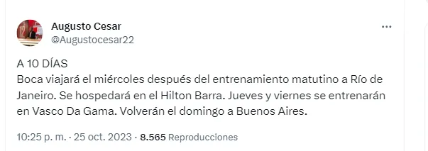 Según informó el periodista Augusto César, el plantel de Boca viajará el miércoles 1° de noviembre tras el entrenamiento matutino. Se hospedará en el hotel Hilton de Barra da Tijuca. Tendrá prácticas de fútbol el jueves y el viernes en Vasco Da Gama y el domingo regresará a Buenos Aires.