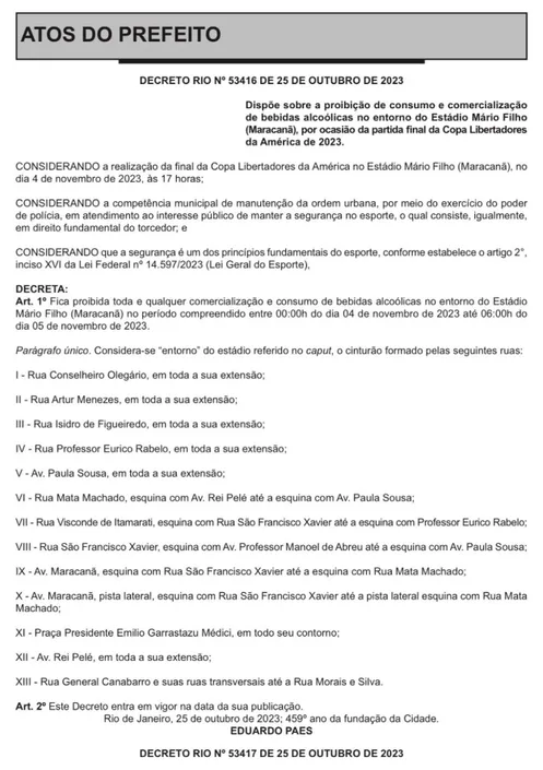 La misma prohibe la comercialización de todo tipo de bebidas alcohólicas en las avenidas cercanas al estadio entre las 00:00 del sábado 4 de noviembre y el 05:00 del domingo 5. La medida fue anunciada en un boletín oficial durante la tarde del miércoles 25 de octubre. Y, dentro del comunicado, explica qué calles están marcadas como el “entorno” del Maracana.