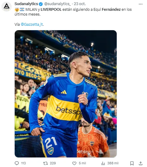 En Europa se habla hace rato de Fernández y su nivel. Pero no solo el Milan y Porto lo tienen en carpeta: también se mencionan intereses por parte del Liverpool de Inglaterra y el Benfica de Portugal. ¿Equi tiene los días contados en Boca?