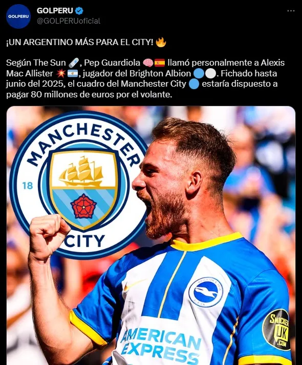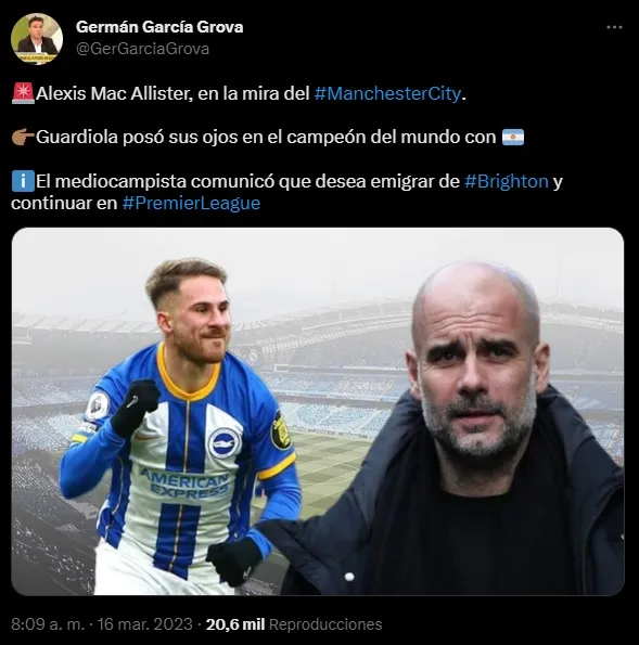 Tras consagrarse campeón con la Selección Argentina en el Mundial de Qatar 2022, Alexis Mac Allister vive un gran presente personal. Es una de las grandes figuras del Brighton de Inglaterra y cada día mejora más en la Premier League. Tal es así que se ganó el interés del Manchester City.