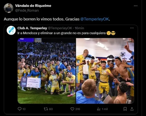 Es más, fue el mismo Temperley el cual se burló y recordó lo que fue la derrota del Millonario. ¿De qué manera? Una publicación en sus redes sociales oficiales la cual horas después borraron, pero que no pudo evitar de hacerse viral.