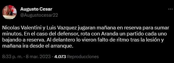 El periodista Augusto César reveló que Luis Vázquez jugará para el equipo de Mariano Herrón este viernes a las 20 frente a Banfield. “Nicolas Valentini y Luis Vazquez jugaran mañana en reserva para sumar minutos. En el caso del defensor, rota con Aranda un partido cada uno bajando a reserva. Al delantero lo vieron falto de ritmo tras la lesión e irá desde el arranque“, contó.