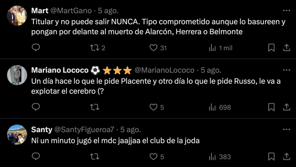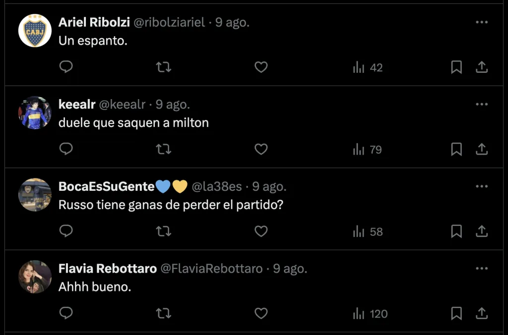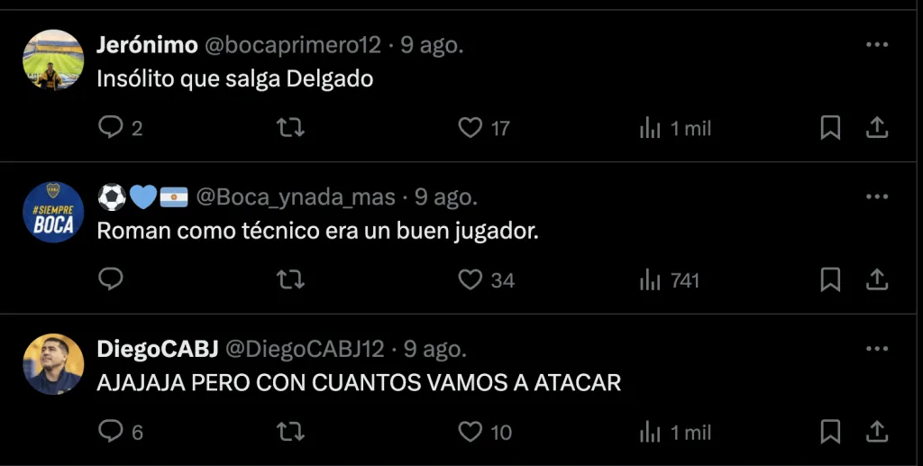 Esto generó el enojo de los hinchas con el DT ya desde la previa del partido. Y acompañado con el mal presente que atraviesa el club, los Xeneizes lo hicieron notar en las redes sociales: “Otro día más pidiendo a Milton Delgado cómo el 5 titular de Boca”, “Insólito que salga Delgado”, y “¿Qué hizo Delgado para no jugar?”