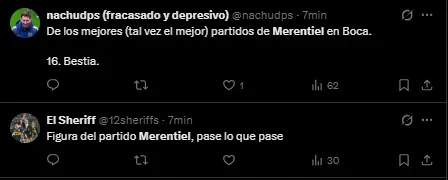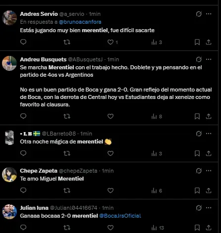 “Otra noche mágica de Merentiel“, “Te Amo Miguel“, “Está afilado“, fueron algunos de los comentarios de los hinchas en X (Twitter) sobre el rendimiento del uruguayo esta noche en La Bombonera.