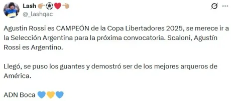 Los simpatizantes del cuadro brasileños no fueron los únicos en destacarlo. Tras su pasado en el club, los “Xeneizes” hicieron tendencia al arquero en “X”. Por un lado, algunos usuarios pidieron por su retorno para un 2026 muy competitivo, mientras que otros reconocieron su gran presente. “Volvé a Boca“, “La verdad que se merece todo“, “Orgullosos de verte triunfar” o “Demostró ser de los mejores“, fueron algunos comentarios.