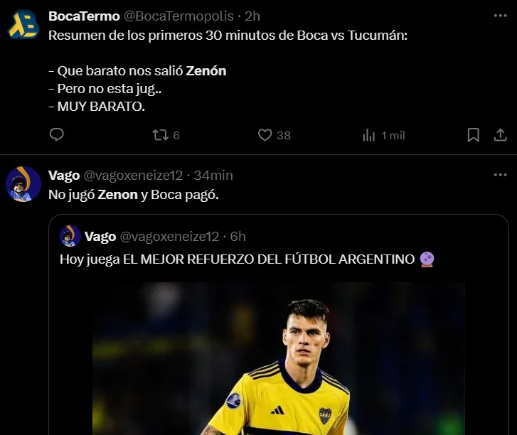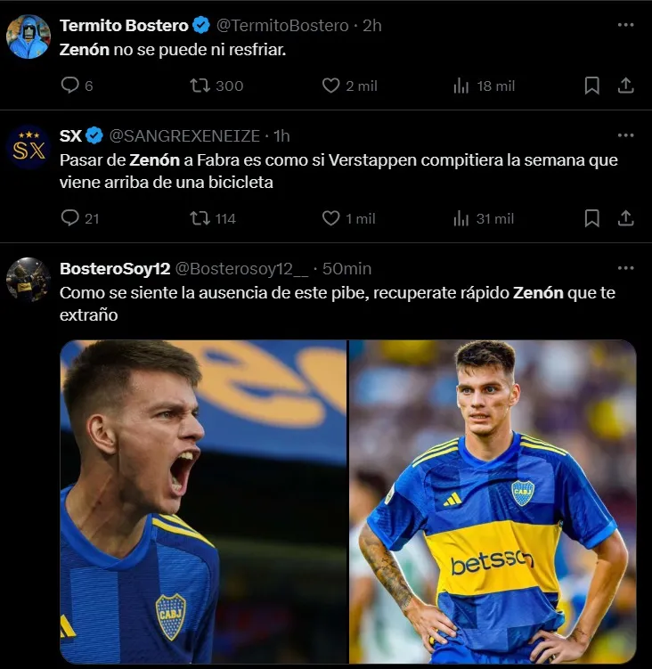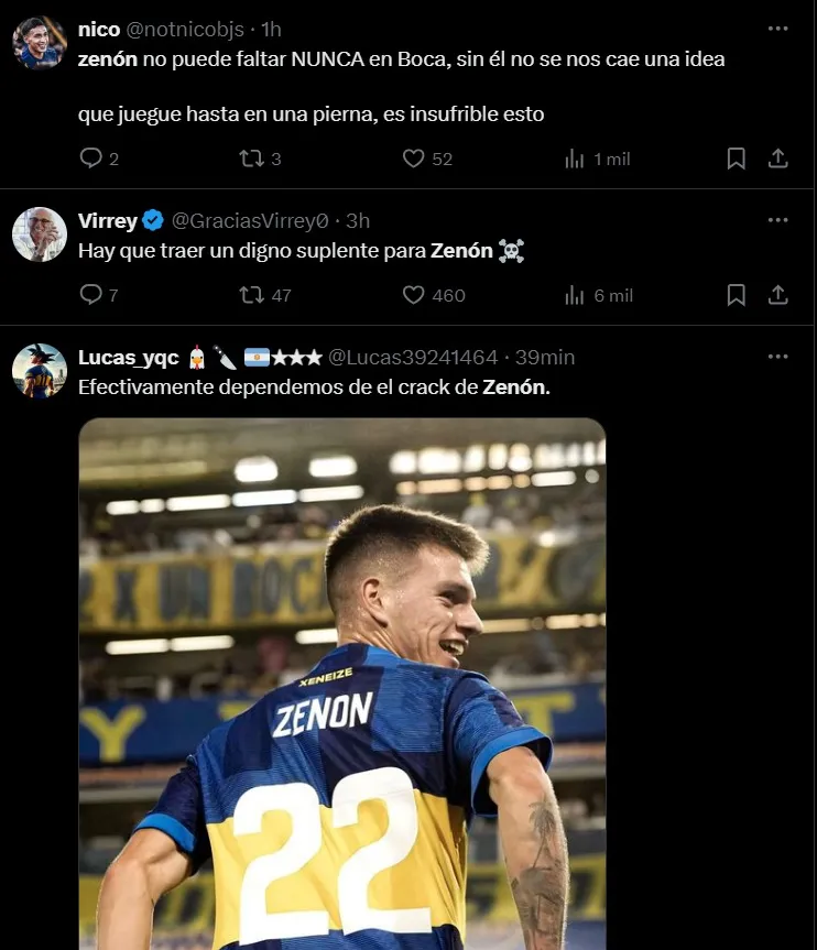“Hay que traer un suplente digno de Zenón“, “No puede faltar nunca en Boca“, “Dependemos de él“, “Recuperate rápido que te extraño“, fueron algunos de los comentarios de los fanáticos Xeneizes sobre el ex Unión. Con él desde el arranque, el Xeneize solamente perdió 4 partidos, el último de ellos por penales frente a Estudiantes por la semifinal de la Copa de la Liga.