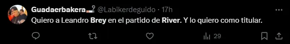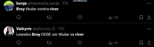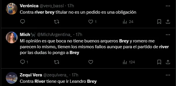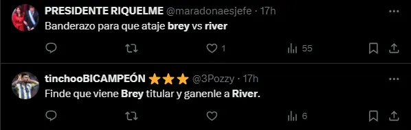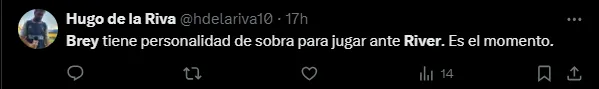 “Brey tiene personalidad de sobra para jugar ante River. Es el momento“, expresó un simpatizante en la red social de X (Twitter). En esa sintonía, otra cuenta fanática de Boca fue más contundente y marcó: “Contra River, Brey titular. No es un pedido, es una obligación“.