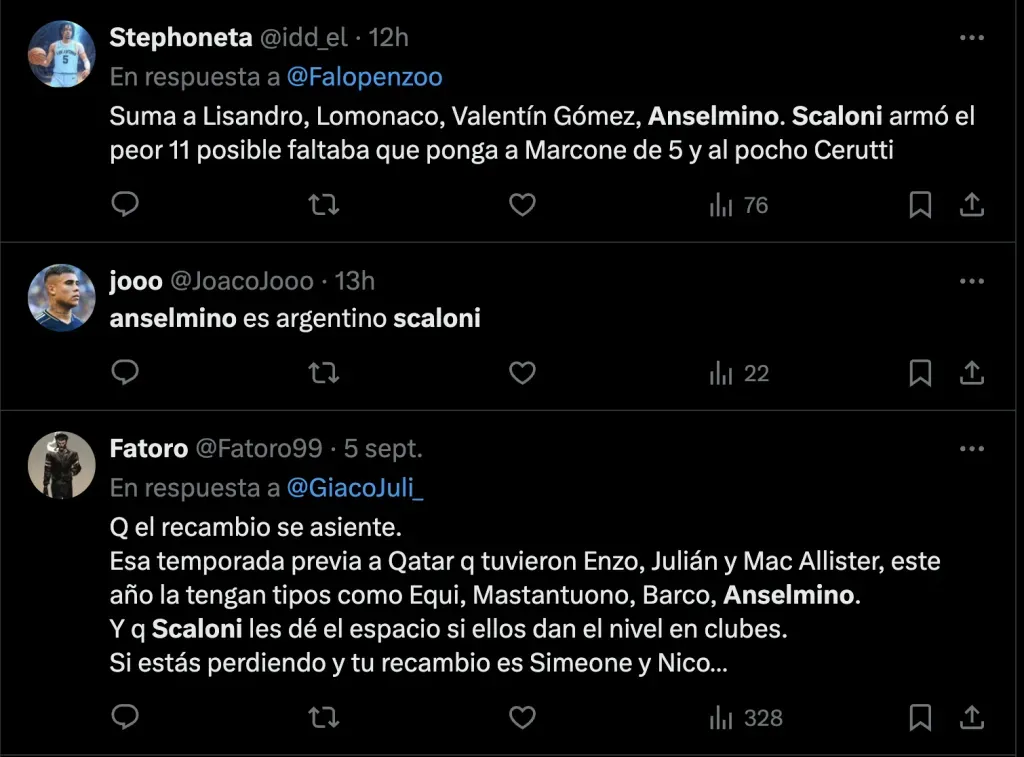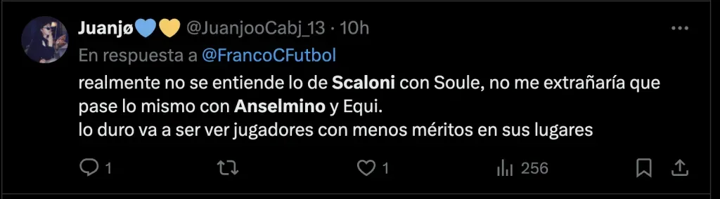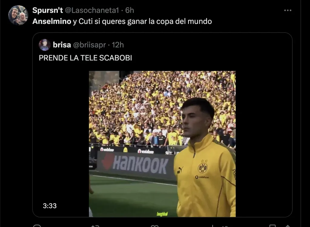 Y por el lado de los hinchas de Boca uno de ellos fue Aaron Anselmino, reciente refuerzo del Borussia Dortmund el cual tuvo un buen debut por en la Bundesliga. Y que por su presente, los hinchas Xeneizes quieren verlo en el equipo nacional: “Ojalá Scaloni lo vea”, “Anselmino es argentino” y “Anselmino y Cuti si querés ganar la Copa del mundo”.