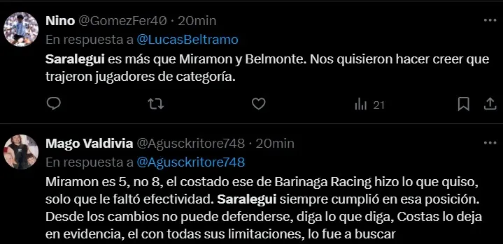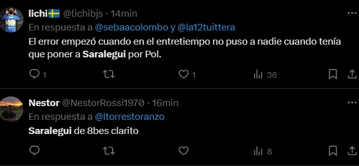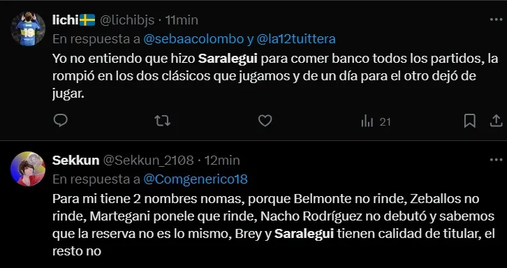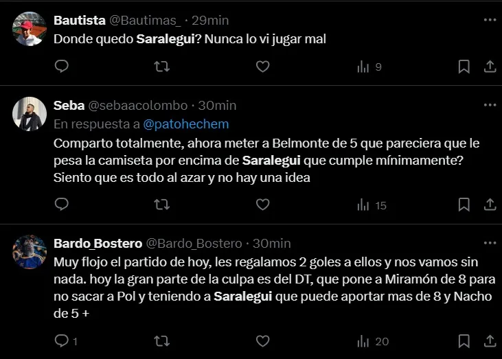 “Donde quedó Saralegui? Nunca lo vi jugar mal“, “No entiendo qué hizo Saralegui para comer banco todos los partidos“, “Tiene calidad de titular“, expresaron los hinchas en las redes.