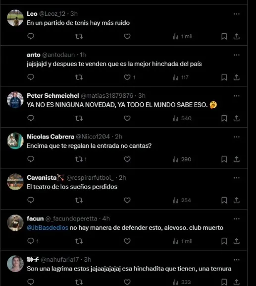 Y es que, como ha sucedido en anteriores ocasiones, un viral video circuló por la red social de Twitter en donde puede verse a los hinchas del elenco millonario totalmente callados y quietos cuando el encuentro estaba empatado y su equipo tenía la posibilidad de darlo vuelta. Como era de esperarse, esto trajo consigo la reacción de los fanáticos xeneizes.