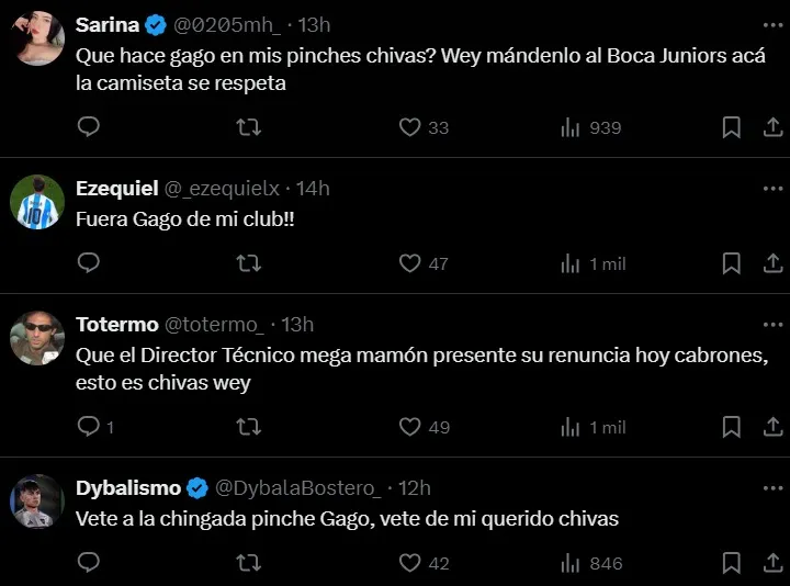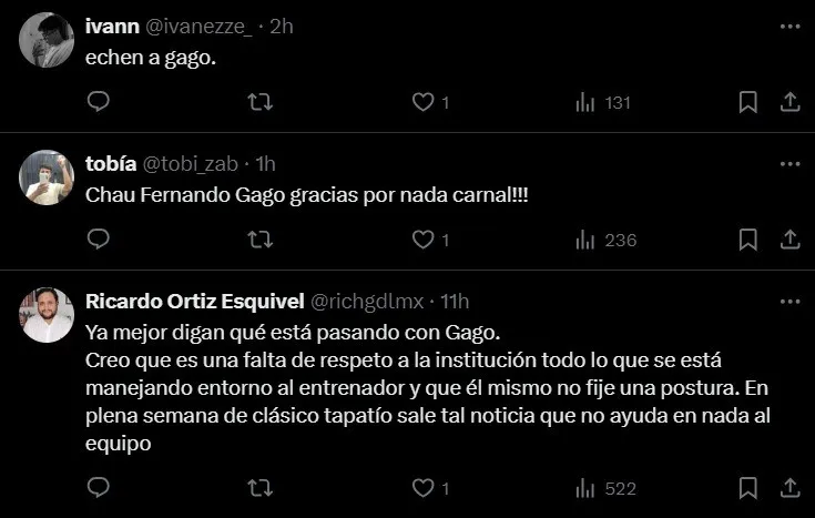 “Echen a Gago“, fue uno de los mensajes más picantes de un usuario en referencia al técnico. Otro hincha fue más allá y marcó: “Chau Fernando Gago, gracias por nada carnal“. “¿Qué hace Gago con mi pinche Chivas? Mándenlo al Boca Juniors, acá la camiseta se respeta“, dijo otra fanática en la misma sintonía.