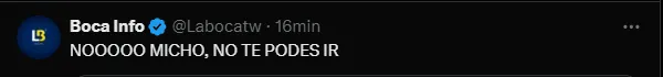“Nooo Micho, no te podés ir“, fue el comentario del usuario de X (Twitter) llamado ‘Boca Info’. En esa misma sintonía, otras cuentas fanáticas del Xeneize expresaron sus “ganas” de que no se vaya del Millonario. Otros hinchas también subieron diferentes memes con personas llorando por lo sucedido.