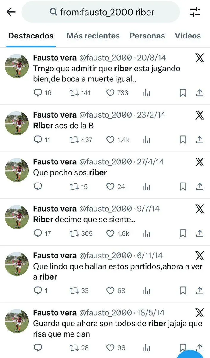 “Riber sos de la B”, “Que pecho sos Riber”, “Riber decime que se siente…”, “Guarda que ahora son todos de Riber, que gracia me dan”, son algunos de los posteos que escribió Fausto en su cuenta de X (Twitter) en aquel entonces.