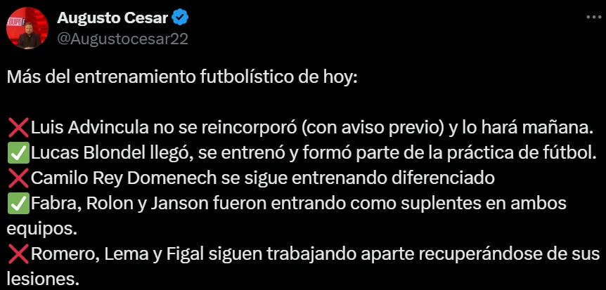 Durante el entrenamiento de este jueves, hubo otros detalles que informó Augusto César. Por un lado, Luis Advíncula estuvo ausente en el entrenamiento de hoy, con aviso previo, y se reincorporará a partir de mañana. El peruano debió atender unos asuntos en su país de carácter administrativo y familiar. El que sí se sumó fue Lucas Blondel, quien regresó luego de haber jugado con Suiza en la fecha FIFA. El lateral fue parte del ensayo formal.