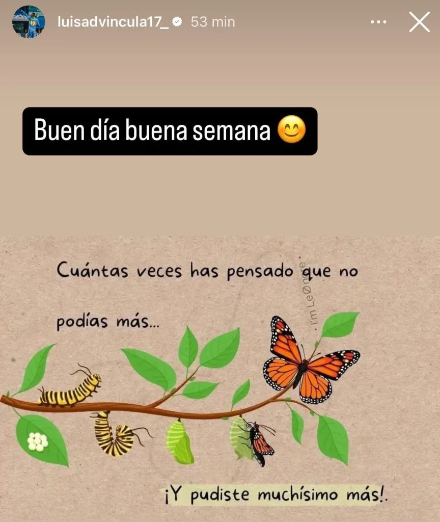 De esta manera, con una foto de una rama, orugas y mariposas, el jugador publicó: “Buen día, buena semana. Cuántas veces has pensado que no podías más .¡Y pudiste mucho más!”.