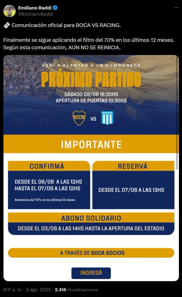 Boca no reiniciará el filtro de socios para el partido contra Racing: los detalles