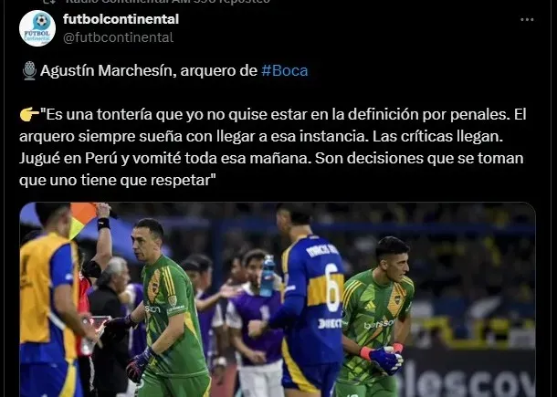 Y ahora, Marchesín dio su versión de los hechos en una entrevista con Radio Continental. Y explicó el motivo de su salida: “Si hay penales también decidirá el DT qué es lo mejor para el equipo, como Fernando (Gago) lo hizo. Es un DT extraordinario, una persona que siempre admiré. Y él decidió y uno lo tiene que respetar. Leandro es muy bueno en ese sentido y venía de atajar cuatro penales contra Gimnasia. El técnico decidió que lo mejor para el equipo era eso y uno lo respeta porque uno también quiere lo mejor y hacer lo que sea para lograr la clasificación”.