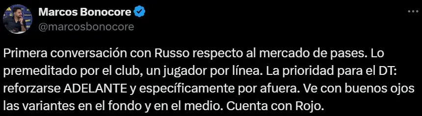 El central no viene atravesando un buen momento en su relación con el hincha y se especula con su salida a fin de año cuando vence su contrato. Sin embargo, se reveló que Russo cuenta con Rojo para el torneo internacional y lo que viene después del mismo. Esta información fue contada por el periodista Marcos Bonocore en su cuenta de X (Twitter). “Ve con buenos ojos las variantes en el fondo y en el medio. Cuenta con Rojo“, señaló el cronista.