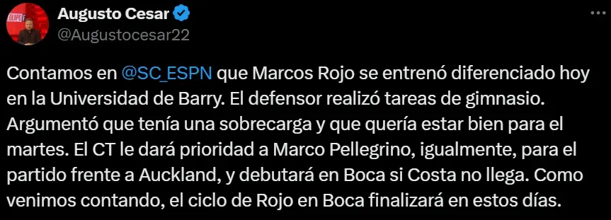 A su vez, César contó cuándo es que podría darse el anuncio del fin de ciclo de Rojo. “Tengo entendido que va a jugar a Pellegrino y el ciclo de Rojo se va a terminar. Veremos si por estas horas, si cuando Boca vuelva a Buenos Aires, si durante la estadía aquí si clasifica”, explicó. Y concluyó: “Si Costa y Pellegrino están por delante en la consideración de Rojo, es todo un indicio de que aquí el ciclo está cumplido”.