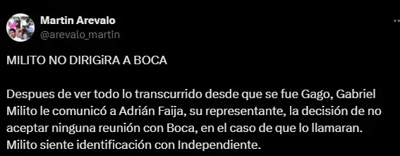 Mientras que el periodista de ESPN, Martín Arévalo, también lo confirmó: “Milito no va a dirigir Boca. Después de ver todo lo transcurrido desde que se fue Gago, Gabriel Milito le comunicó a Adrián Faija, su representante, la decisión de no aceptar ninguna reunión con Boca, en el caso de que lo llamaran. Milito siente identificación con Independiente“.