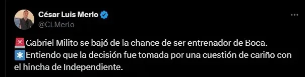 Por ejemplo, el periodista César Luis Merlo citó en su cuenta de “X”: “Gabriel Milito se bajó de la chance de ser entrenador de Boca. Entiendo que la decisión fue tomada por una cuestión de cariño con el hincha de Independiente“.