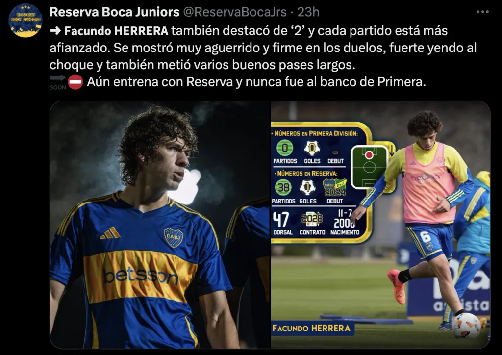 Facundo Herrera, por su parte, todavía no pudo hacer su debut oficial en la Primera División de Boca. Y con sus 19 años, el central tiene vínculo con el cuadro de la Ribera hasta finales del 2027 (Según Transfermarkt).