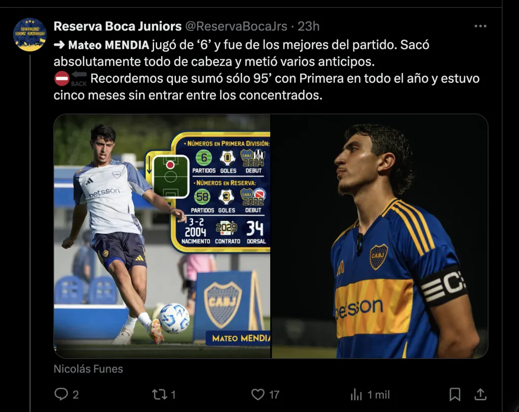 Mateo Mendía ya hizo su debut en la Primera de Boca en 2024 con Diego Martínez por Copa Sudamericana. Y en el Xeneize, el juvenil tiene contrato hasta diciembre del 2029.