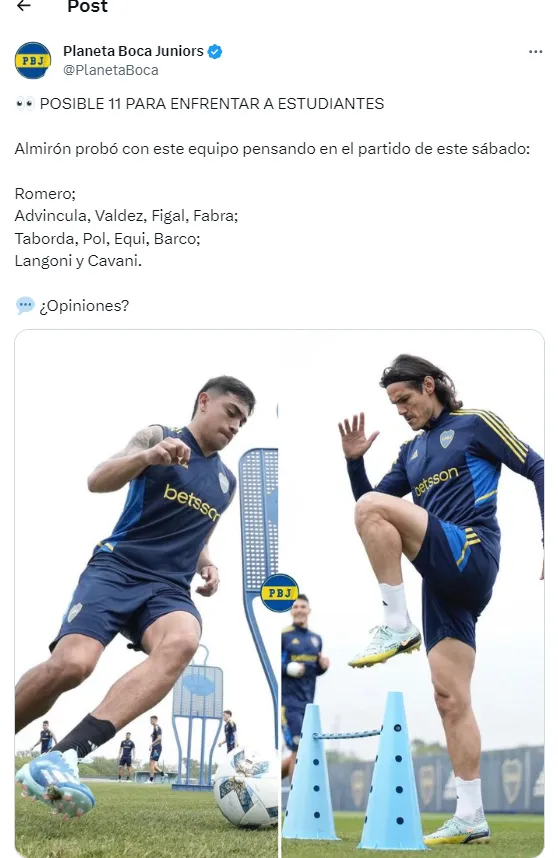 El equipo que probó Almirón en la práctica matutina: Sergio Romero; Luis Advíncula, Bruno Valdez, Nicolás Figal, Frank Fabra; Vicente Taborda, Guillermo Fernández, Ezequiel Fernández, Valentín Barco; Luca Langoni y Edinson Cavani.