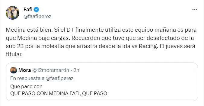 “Medina está bien. Si el técnico utiliza este equipo es para que él baje cargas”, contó el periodista Facundo Pérez, de DSports Radio.