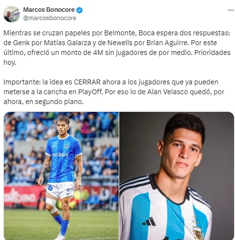 Boca ofreció 3 millones de dólares por la mitad del pase de Matías Galarza y espera la respuesta del GENK de Bélgica. Además, hizo un nuevo ofrecimiento por Brian Aguirre: 4 millones por el 80%, sin jugadores de por medio.