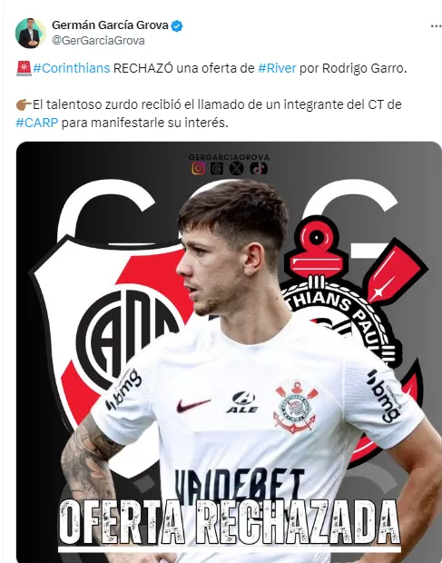 Desde su arribo al Timao, Garro suma 28 partidos jugados: marcó 4 goles y brindó 4 asistencias. ¿Un detalle no menor? Corinthians juega Copa Sudamericana y no le cedería fácil a uno de sus jugadores más importantes a un competidor directo como es el Xeneize.