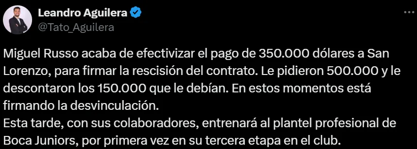 El periodista Leandro Aguilera contó en X (Twitter), que el entrenador terminó arreglando su salida pagando 350.000 dólares. En principio, el club le había reclamado 500.000, pero se descontó de ese valor, la deuda de 150.000 dólares que mantenían con él. De esta manera, la salida de Russo significó un buen negocio tanto para él mismo, como para el Xeneize.