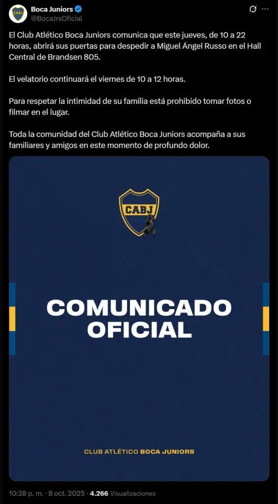 Por otro lado, los hinchas se podrán acercar dentro del horario pautado para poder despedir a Russo en el hall central de La Bombonera. A su vez, Boca informó que para respetar la privacidad de la familia, está prohibido tomar fotografías o grabar videos en el lugar.