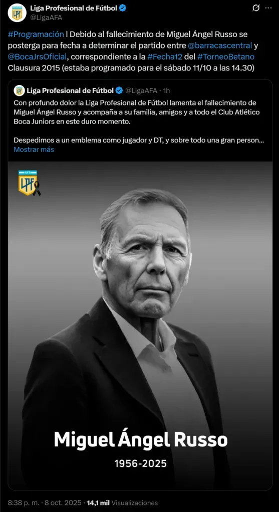 A través de un comunicado en las redes oficiales del torneo, confirmaron la noticia: “Debido al fallecimiento de Miguel Ángel Russo se posterga para fecha a determinar el partido entre Barracas Central y Boca Juniors correspondiente a la fecha 12 del Torneo Betano”.