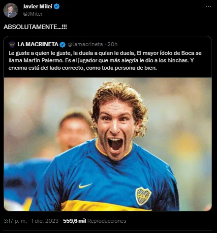 “El mayor ídolo de Boca se llama Martin Palermo. Es el jugador que más alegría le dio a los hinchas. Y encima está del lado correcto, como toda persona de bien“, escribió La Macrineta en la red social. El líder libertario citó el tuit y con mayúsculas sentenció: “ABSOLUTAMENTE…!!!“.