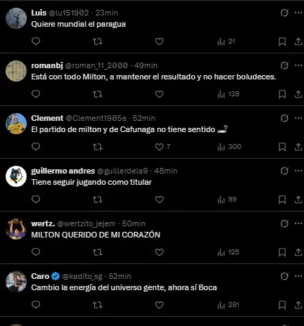 “Está con todo“, “Siempre te tuve fe“, “Milton querido“, “No tiene sentido“, fueron algunos de los comentarios de los fanáticos sobre la tarea del centrodelantero del Xeneize. Viene reemplazando a Edinson Cavani por la distensión que sufrió pero ahora se la puso muy difícil al cuerpo técnico si deciden sacarlo.