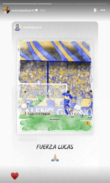 “Fuerza Lucas”, fue la publicación que Morena Beltrán reposteó tras la lesión de Blondel en Boca vs. San Lorenzo. En la foto puede verse un dibujo de lo que fue el reciente gol del ex Tigre frente a Racing en La Bombonera.