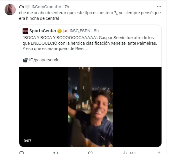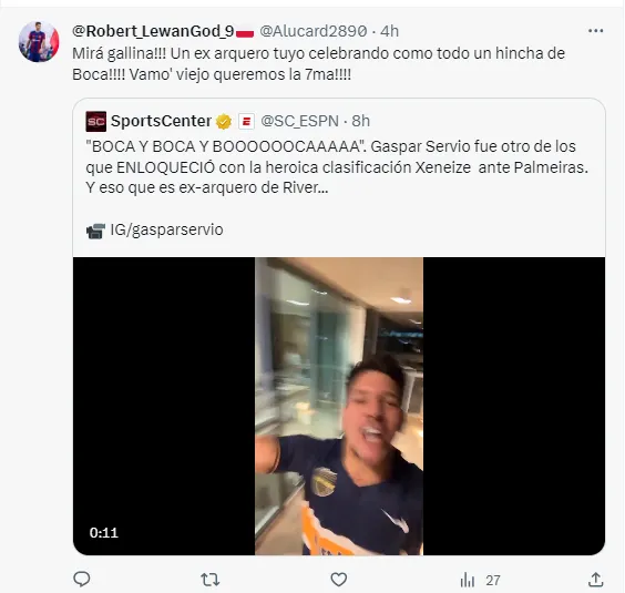 Fue Gaspar Servio, arquero que hizo inferiores en River y fue campeón de la Copa Libertadores Sub 20 con el rival del Xeneize, quien desató toda su locura en sus historias de Instagram: “BOOOOOOCA, BOOOOOCA, VAMOS BOOOOOOCA”, fue el eufórico grito del exBanfield, Rosario Central y Dorados de Sinaloa.