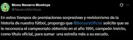 Carlos Navarro Montoya, exarquero de Boca, estalló con lo sucedido e hizo un reclamo puntual por un título del pasado que el Xeneize no pudo lograr. “En estos tiempos de premiaciones sorpresivas y revisionismo de la historia de nuestro fútbol, propongo que Boca solicite que se le reconozca el campeonato obtenido en el año 1991, campeón invicto, como título oficial, para sumar una estrella más a su escudo“, señaló el Mono en X (Twitter).