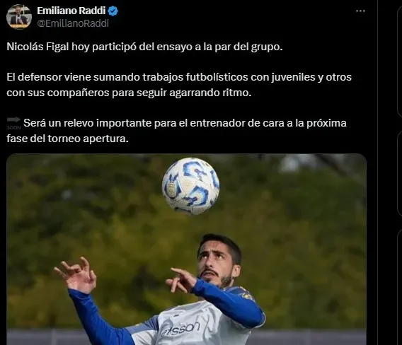 Según informó el periodista Emiliano Raddi para Planeta Boca Juniors, Nicolás Figal participó del ensayo de este martes a la par de sus compañeros en el club. Y todo parece indicar que su regreso está cada vez más cerca.