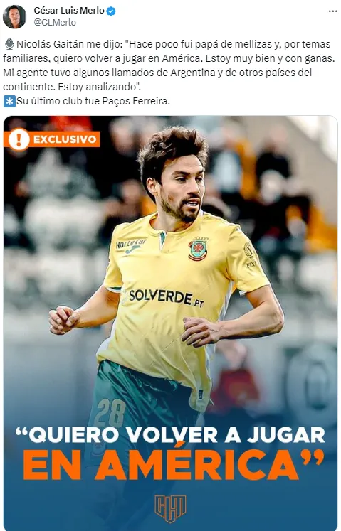El periodista César Luis Merlo hizo público el mensaje que le envió el delantero surgido en Boca: “Hace poco fui papá de mellizas y, por temas familiares, quiero volver a jugar en América. Estoy muy bien y con ganas. Mi agente tuvo algunos llamados de Argentina y de otros países del continente. Estoy analizando”.