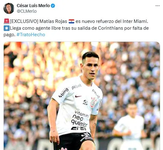 Hace unos días, el futbolista volvió a estar en el centro de la escena al declararse libre por una deuda que tenía el Timao por derechos de imagen. Con el pase en su poder aparecieron varios interesados, entre ellos el Xeneize, quien deseaba cumplir uno de los deseos de Juan Román Riquelme. El mediocampista ya tomó una decisión y finalmente no llegará a Brandsen 805. De acuerdo a la información que brindó César Luis Merlo, Rojas es nuevo refuerzo del Inter Miami.