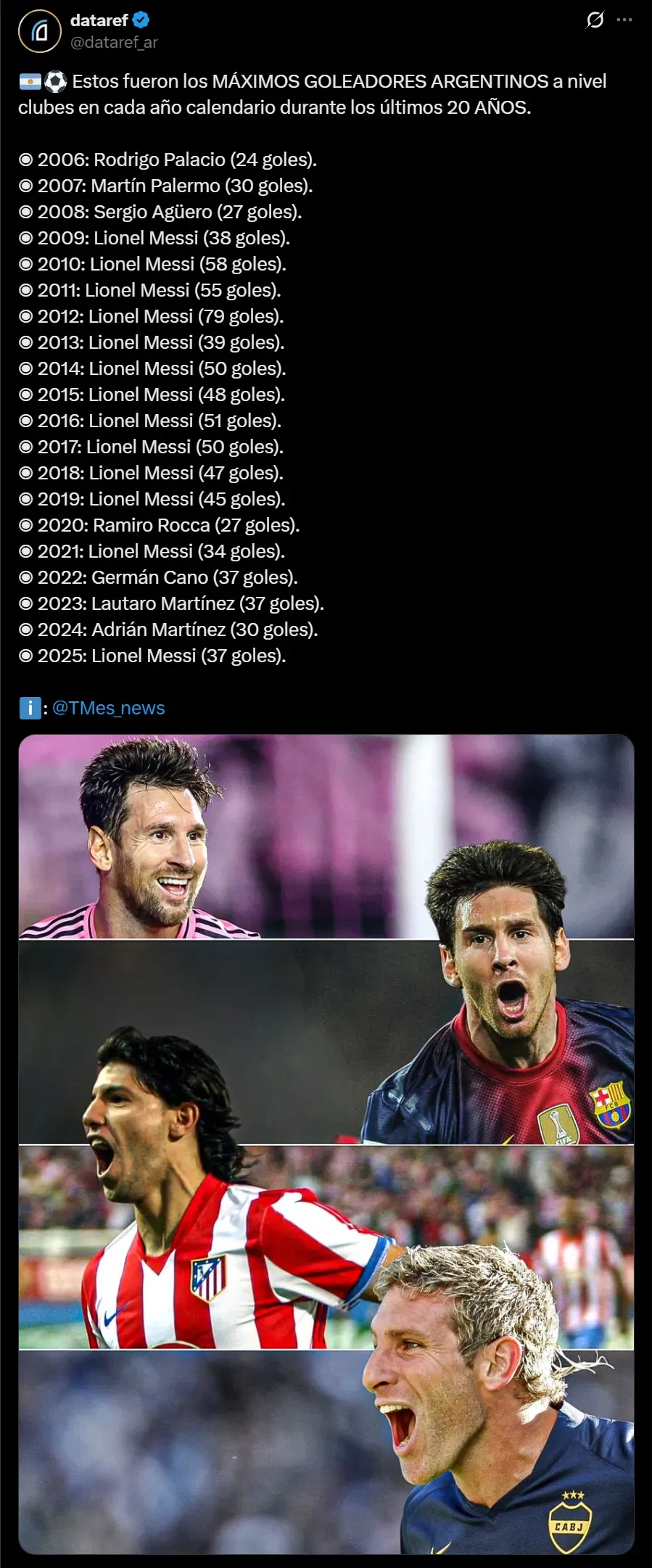 Luego, tras el 2008 donde Sergio Agüero fue el goleador argentino en el mundo, Leo Messi se hizo amo y señor de los goles albicelestes desde el 2009 hasta el 2019. Al año siguiente, Ramiro Rocca, delantero que en ese entonces jugaba en el fútbol de Guatemala, terminó con el dominio del “10”. Sin embargo, en 2021 retomó el trono para luego ceder ante el gran 2022 de Germán Cano con Fluminense. Ya en 2023, Lautaro Martínez lo destronó pero no pudo mantenerse y en 2024, Adrián “Maravilla” Martínez le quitó el lugar. Sin embargo, con el 2025 llegando a su fin, Messi con 38 años volvió a convertirse en el máximo goleador argentino en el fútbol mundial con 37 tantos marcados.