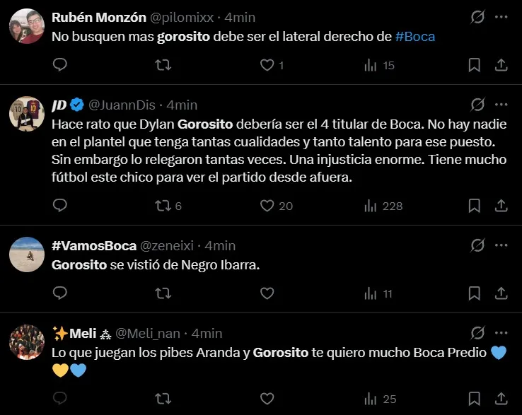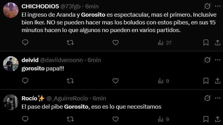 Ante sus buenas actuaciones, los simpatizantes se expresaron sobre ellos en X (Twitter). Y muchos incluso quieren verlos como titulares ante Gimnasia de Mendoza. “¿Qué mas tienen que demostrar para estar en el once?” y “Sus ingresos fueron espectaculares” son algunos de los posteos.