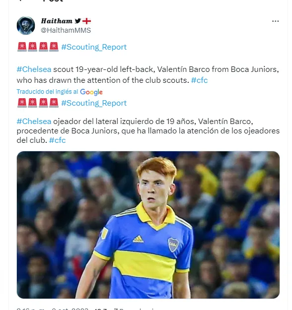 La información que brindó el cronista del fragmento televisivo va en corcondancia con lo que destacan esde Inglaterra. Es que una cuenta especializada en “Scouts del Chelsea” aseguró que “Valentín Barco, lateral izquierdo de 19 años, ha llamado la atención de los ojeadores del club”. Aunque, claro está, corre de atrás ya que los Citizens parecen estar hace un tiempo trabajando en la contratación de la joya.