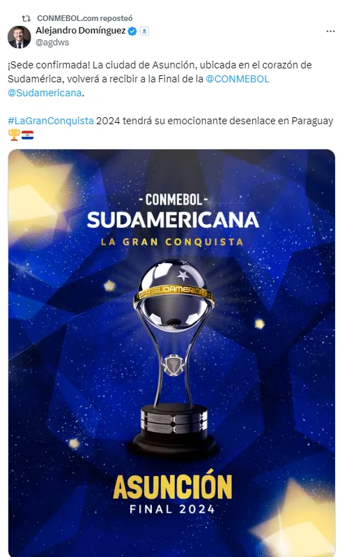 Alejandro Domínguez, presidente de CONMEBOL, confirmó dónde se jugará la final de la Copa Sudamericana 2024. El máximo mandatario de la entidad que regula el fútbol sudamericano anunció en su cuenta de Twitter que la definición del certamen será en Asunción, Paraguay.